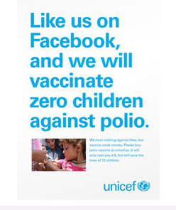 A recent campaign by UNICEF stresses that Facebook “likes” don’t amount to much. Even with 2.6 million likes on its Facebook page, UNICEF really isn’t making enough money to support the various causes. Facebook “likes” are not equal to money or transactions. They just showcase the lowest form of commitment that flippant Facebook users are ready to make.